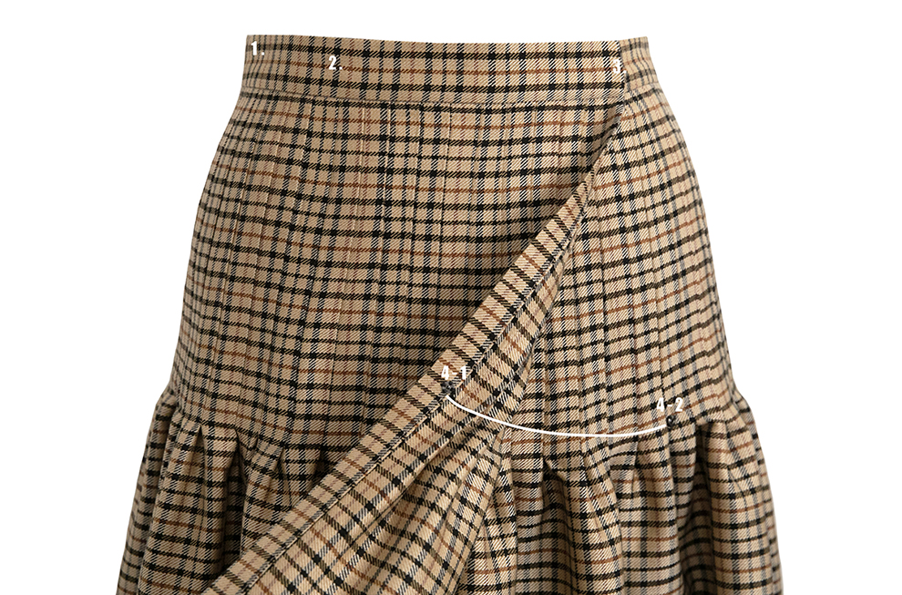 겹침 부분 사이드 끝 10cm는 플리츠 아니게 함.